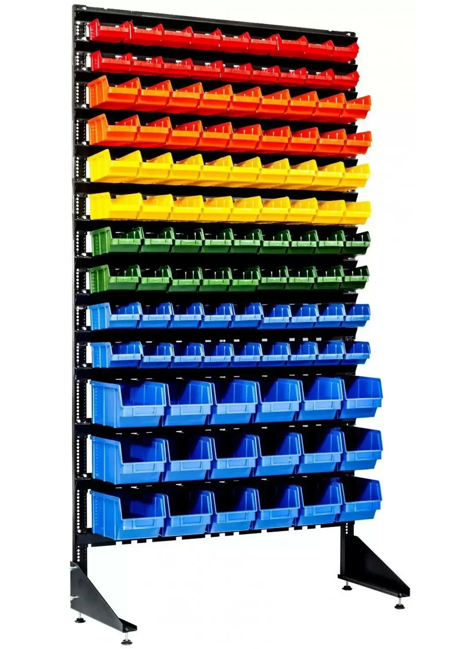 Всё строится вокруг простого набора: металлический каркас плюс пластиковые ящики разных размеров и цветов. Каркас отвечает за жёсткость и ресурс, ящики — за удобную сортировку и выживаемость в ежедневной работе: выдерживают износ, не боятся частой мойки и активного использования. Перфорация на стойках и направляющих позволяет «переизобретать» конфигурацию под текущий ассортимент: подвинули, добавили, поменяли типоразмер — и система уже подстроилась под новые задачи.
