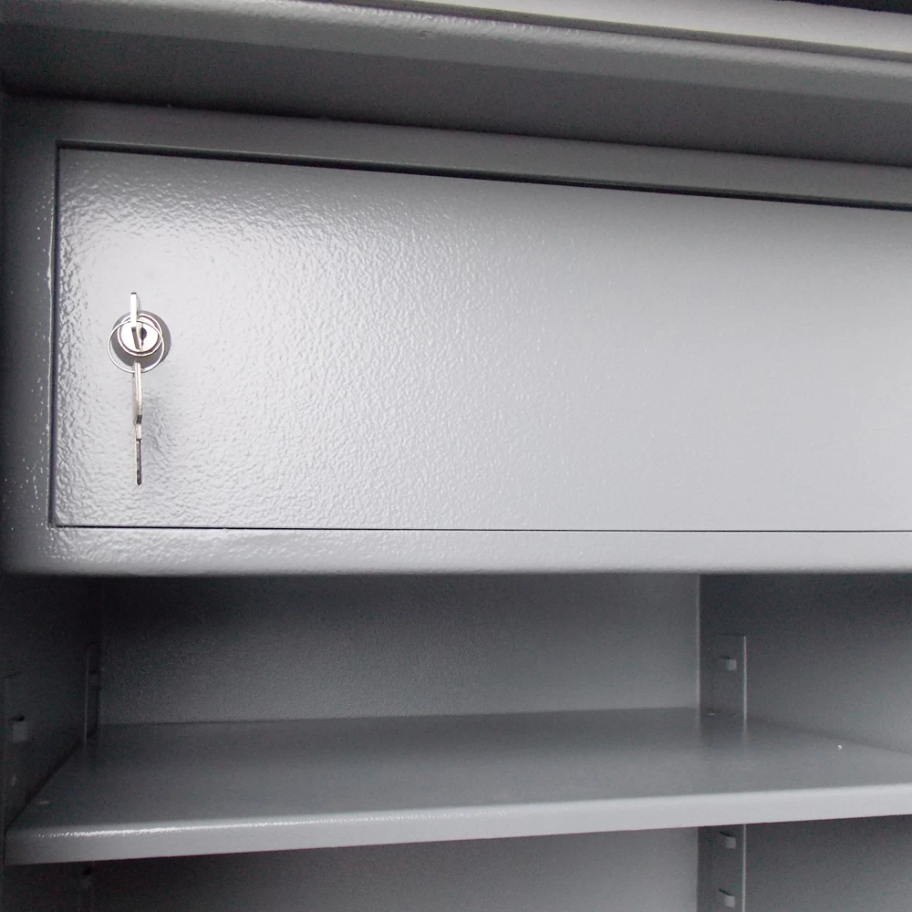 - Сейф имеет в комплекте трейзер (отдельно запираемое отделение для боеприпасов) и 1 полку. Уровень установки полки можно регулировать по высоте.